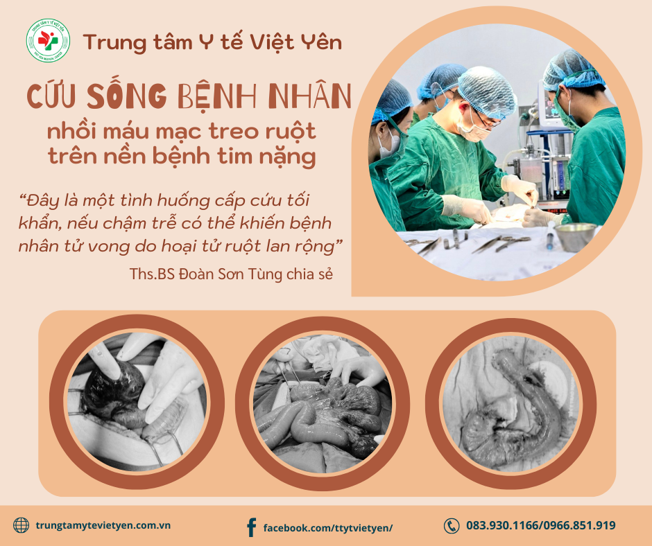 Theo Ths.BSCKII Trần Minh Phương - Giám đốc Trung tâm Y tế Việt Yên, nhồi máu mạc treo ruột là một cấp cứu ngoại khoa hiếm gặp, tiên lượng rất nặng nếu không phát hiện và xử trí kịp thời. Việc Trung tâm Y tế Việt Yên có thể chẩn đoán nhanh, mổ thành công và kiểm soát tốt nguy cơ chảy máu ở bệnh nhân có bệnh nền tim mạch là thành quả của quá trình nâng cao năng lực chuyên môn, đầu tư trang thiết bị và đào tạo bài bản cho đội ngũ y, bác sĩ.