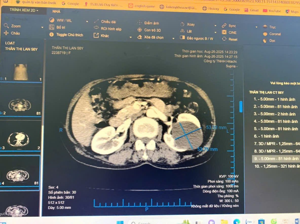 Bệnh nhân TTL (54 tuổi, trú tại xã Hồng Thái, Việt Yên) nhập viện trong tình trạng đau tức vùng thắt lưng trái. Qua thăm khám và chẩn đoán hình ảnh, bác sĩ phát hiện nang thận trái kích thước lớn 6x5 cm. Trước nguy cơ nang tiếp tục phát triển và gây biến chứng, kíp phẫu thuật của Trung tâm Y tế Việt Yên đã quyết định thực hiện phẫu thuật nội soi cắt chỏm nang thận qua đường sau phúc mạc.