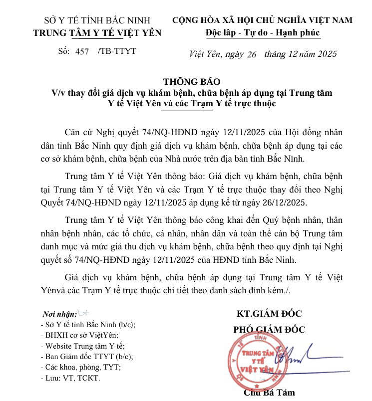 Thông báo thay đổi giá dịch vụ khám, chữa bệnh