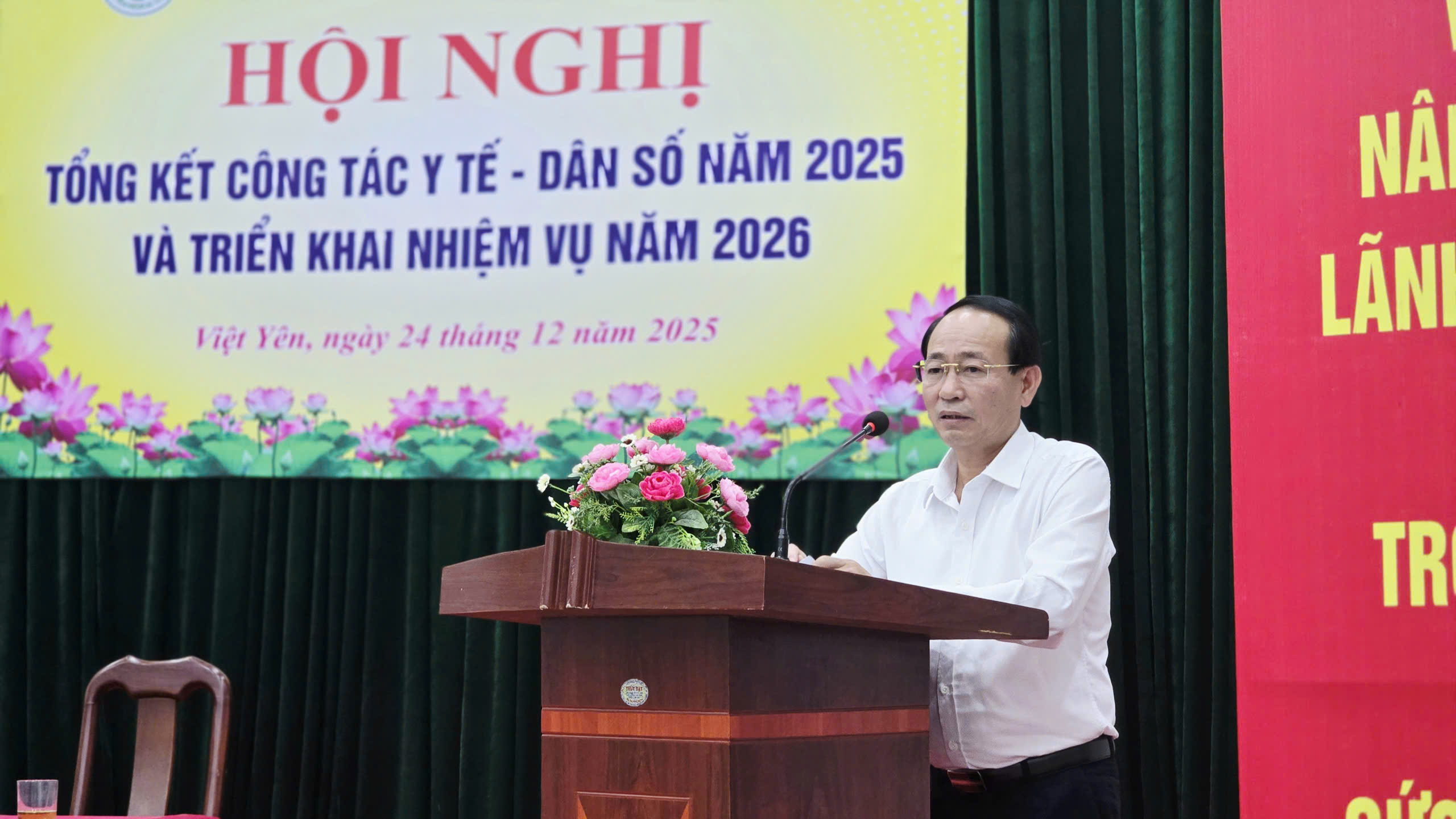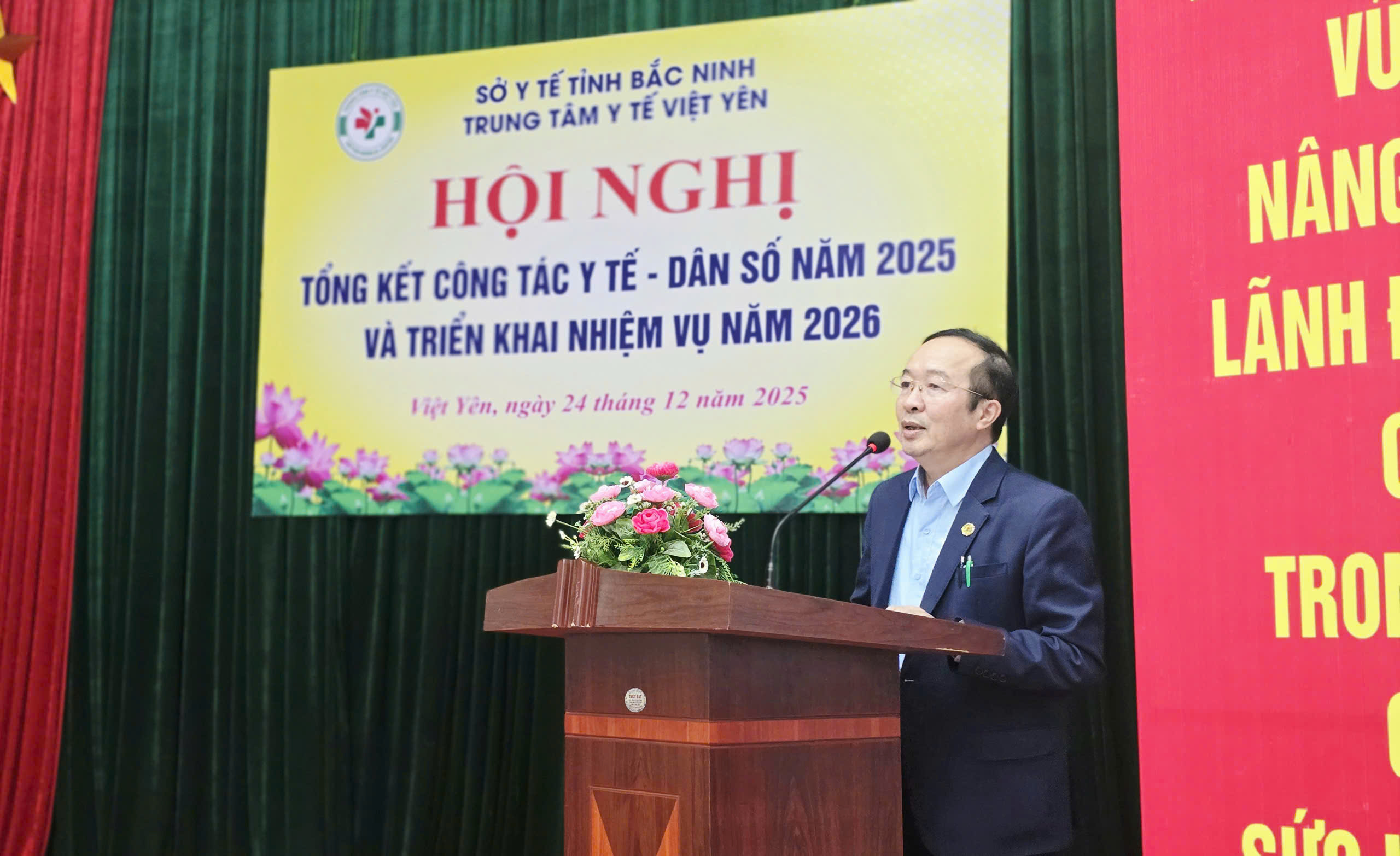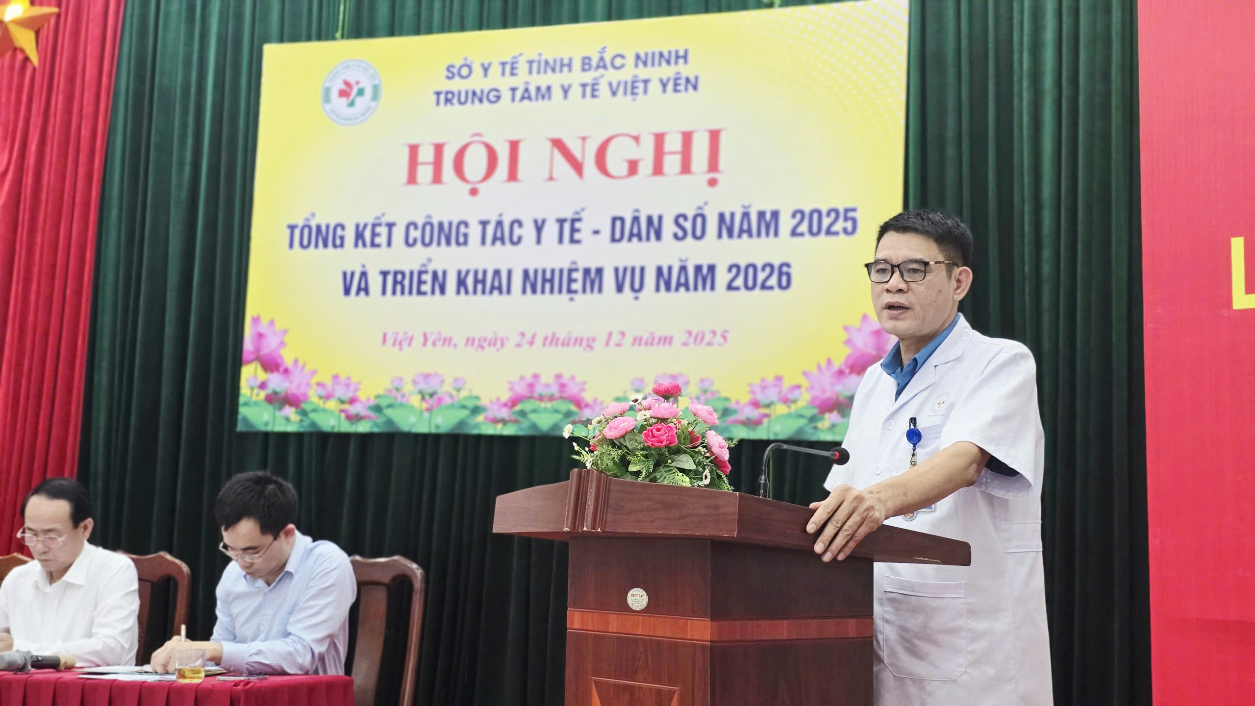 Chiều ngày 24/12/2025, tại Hội trường Trung tâm Y tế Việt Yên đã long trọng diễn ra Hội nghị tổng kết công tác Y tế - Dân số năm 2025 và triển khai phương hướng, nhiệm vụ năm 2026. Hội nghị nhằm đánh giá toàn diện kết quả thực hiện nhiệm vụ năm 2025, chỉ ra những tồn tại, khó khăn và đề ra các giải pháp trọng tâm trong năm 2026.